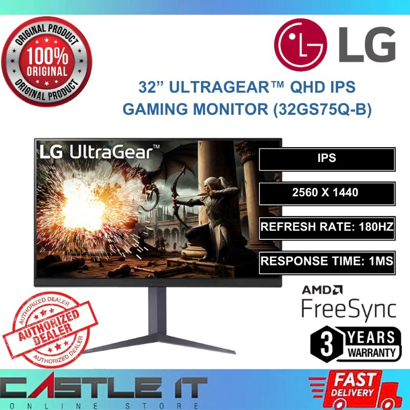 The LG UltraGear 32GS75Q is a 31.5-inch QHD (2560×1440) IPS gaming monitor featuring a blazing-fast 180Hz refresh rate and 1ms (GtG) response time for ultra-smooth gameplay. It supports HDR10 with DisplayHDR™ 400 certification and offers 99% sRGB color accuracy for vibrant visuals. Designed with a 3-side virtually borderless frame, it provides an immersive experience and is compatible with NVIDIA G-SYNC and AMD FreeSync to eliminate screen tearing.