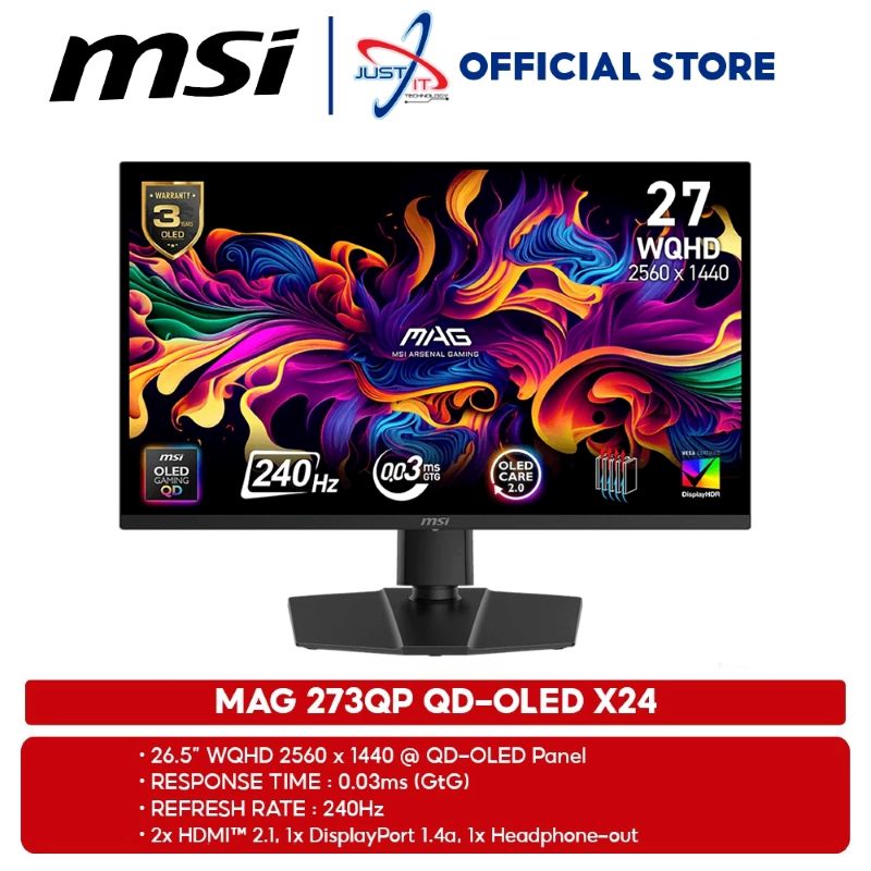 The MSI MAG 273QP QD-OLED 27″ Gaming Monitor features a stunning 2K QD-OLED display, ultra-fast 0.03ms response time, and 240Hz refresh rate for smooth, tear-free gameplay. It supports AMD FreeSync and comes with both HDMI and DisplayPort connectivity for seamless compatibility.