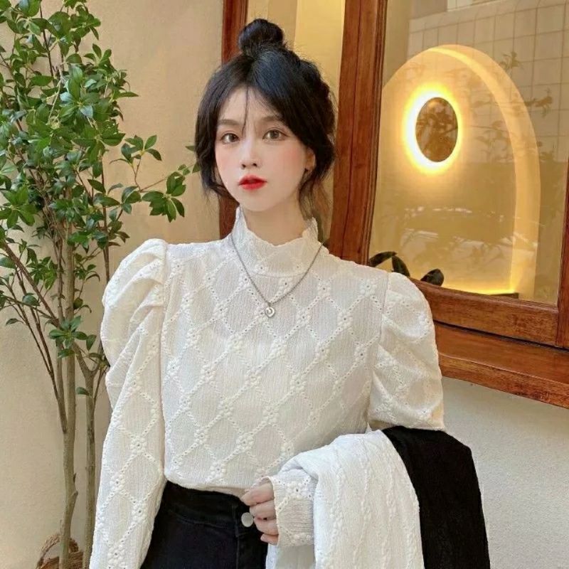 Elevate your layering game with this elegant white lace inner shirt. Featuring a chic high neck and delicate detailing, it’s the perfect bottoming top for autumn and winter.