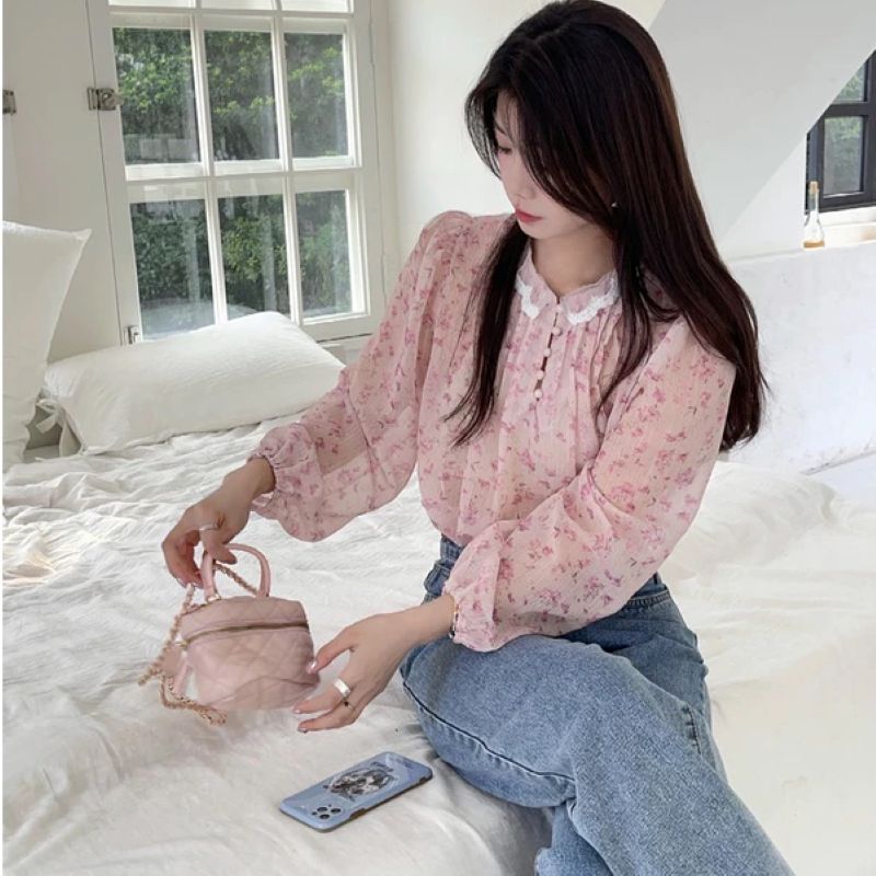 Light, flowy, and effortlessly elegant, this Korean-style floral chiffon blouse features delicate lace details and a relaxed crew-neck fit.