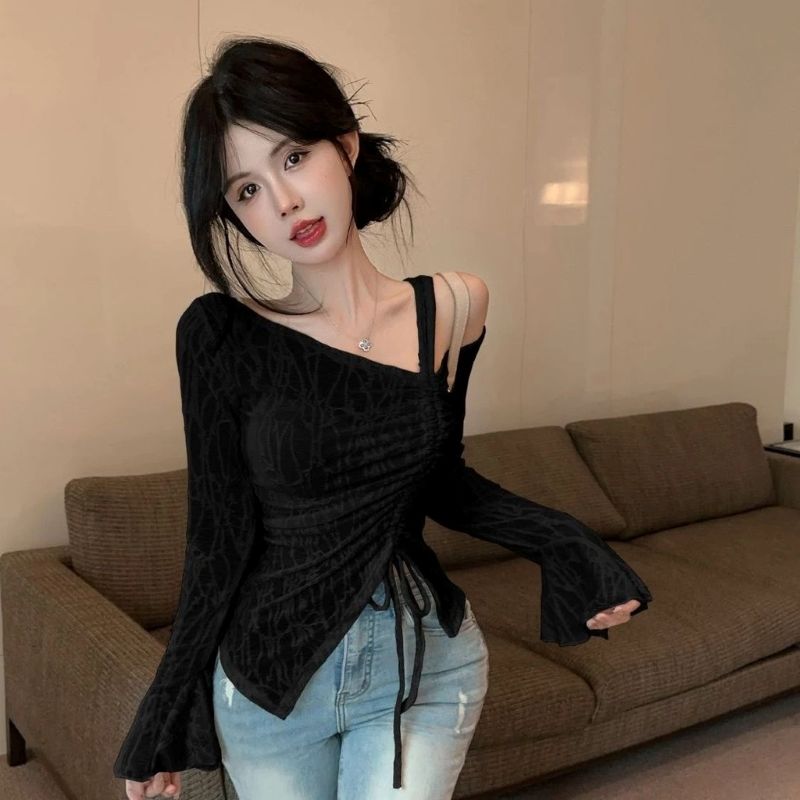 Make a statement with this chic slanted-shoulder blouse, featuring drawstring pleats and elegant flared sleeves. The slim-fit design flatters your figure while adding a touch of niche, fashion-forward charm