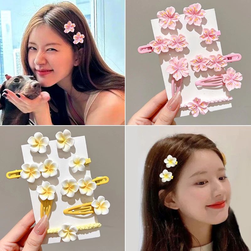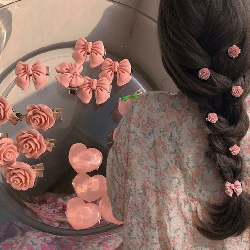 Add a touch of sweet elegance to your look with this Korean-style hair clip set. Featuring delicate bow designs, pink camellia accents, and peach-shaped side clips, it’s perfect for taming stray hairs or styling your bangs.