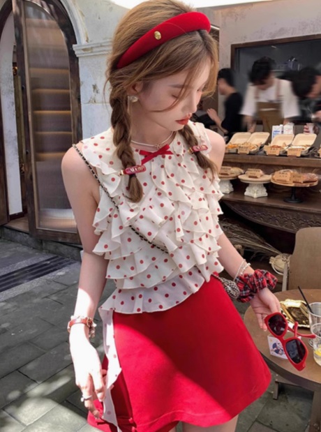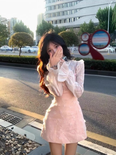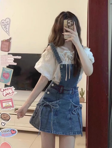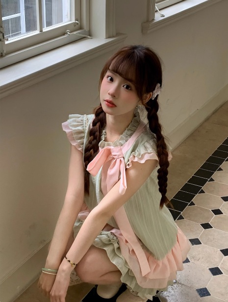 Soft lace details and delicate ruffles give this white blouse a luxurious, princess-like vibe. Paired with a pink suspender dress that cinches at the waist, it’s perfect for creating an elegant and youthful look. Ideal for afternoon tea or a stylish day out!