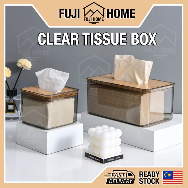 A sleek, clear tissue storage box that blends practicality with elegance. The transparent body makes it easy to see when tissues are running low, while the wooden cover adds a warm, natural touch.