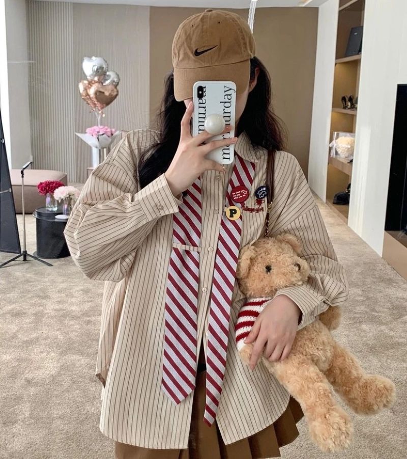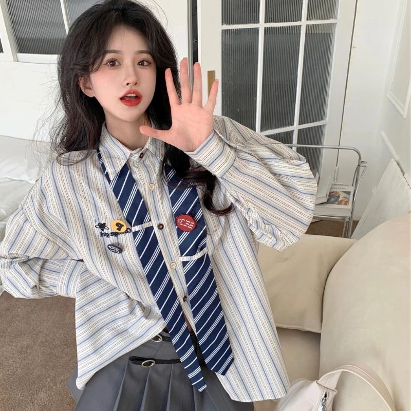 Stay cute and casual with this loose-fit striped shirt featuring a playful tie design. Perfect for students or bestie outfit days.