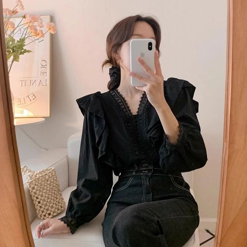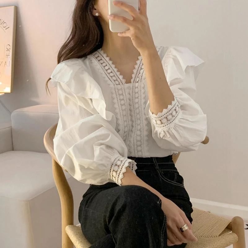 Effortlessly elegant, this long-sleeved top features a flattering lace V-neck design and a clean, minimal Korean-style silhouette.