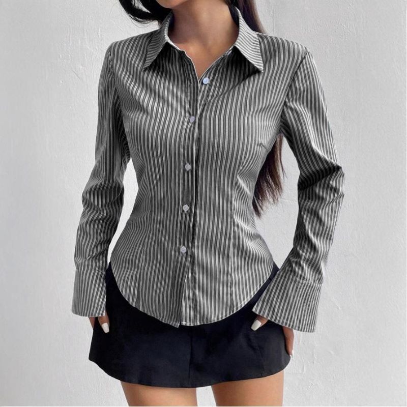 Chic and modern, this slim-fit shirt features elegant bell sleeves and subtle stripes that flatter your figure.