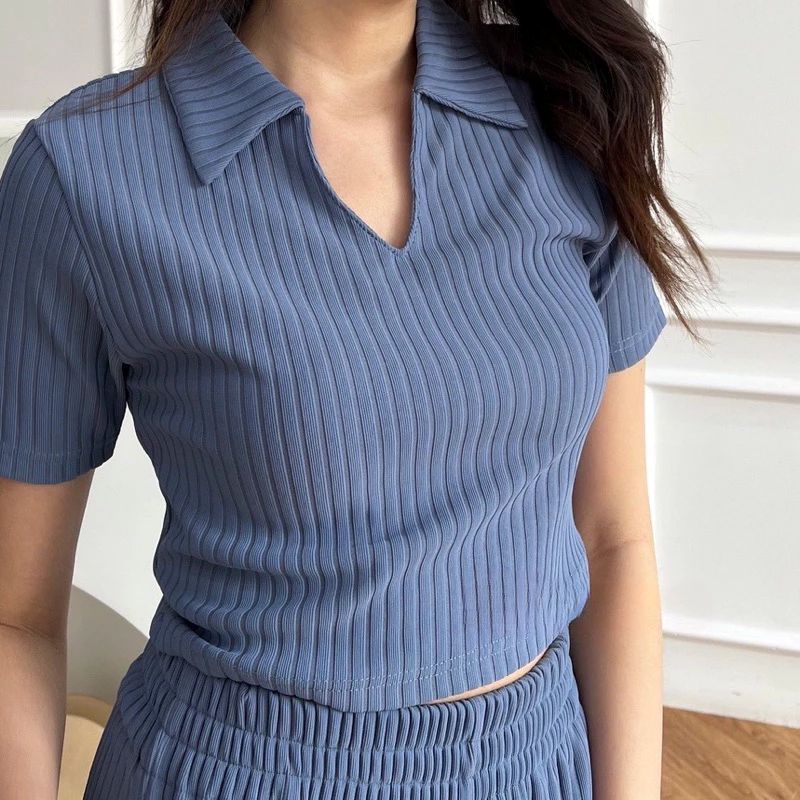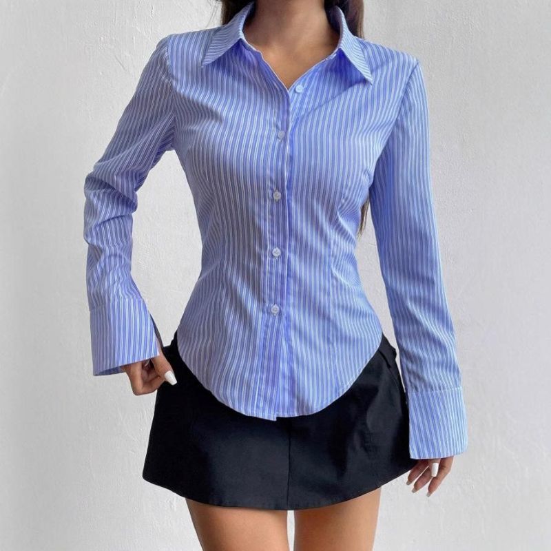 This stylish long-sleeved shirt features a slim-fit cut with an irregular hem for a flattering, modern silhouette. The blue stripes and V-neck design bring out a clean, elegant Korean look.